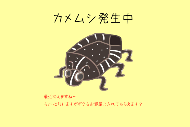最近の気温低下に伴い、カメムシが越冬の為、ログハウスに侵入を開始しております。